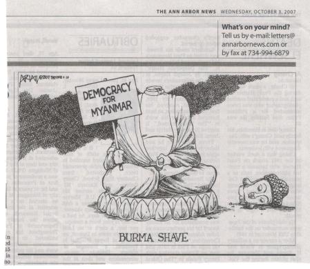 The editorial cartoon picture of a decapitated Buddha that was published in The Ann Arbor News on Oct 3 is plainly disgusting and is clearly an insult. It serves no purpose other than to hurt the feelings of people who respect Lord Gautama Buddha. Having worked for the Central Intelligence Agency’s “Campaign for Tibet” for more than four years in the past, I have come to the following conclusions.