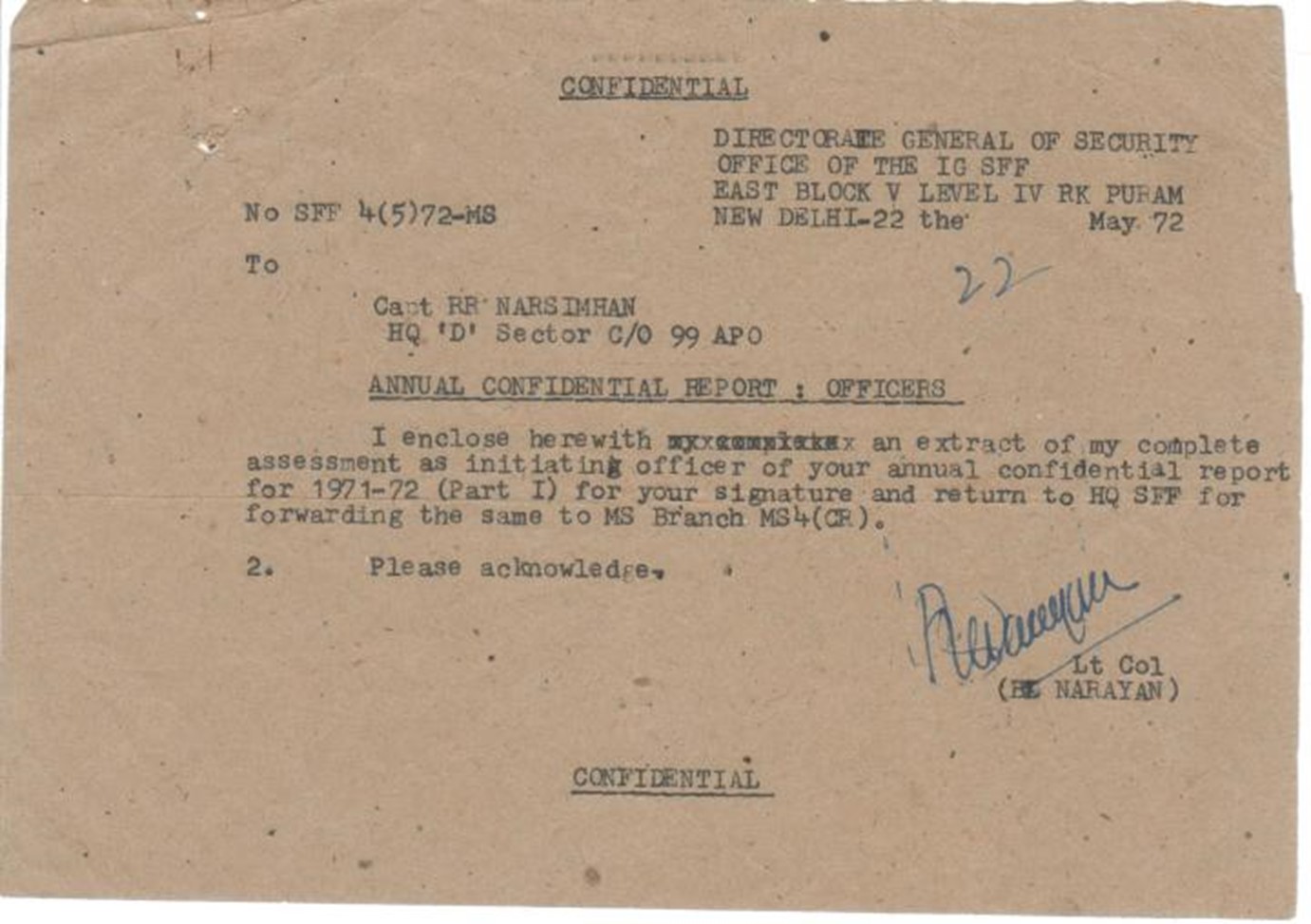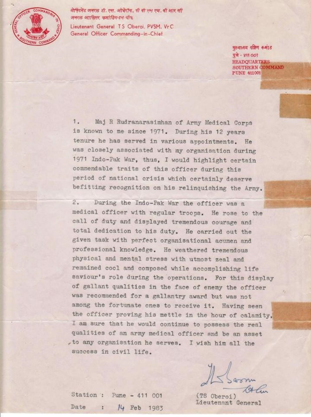 1.” Major R. Rudranarasimham of Army Medical Corps……….was closely associated with my organization during 1971 Indo-Pak War, thus, I would highlight certain commendable traits of this officer during this period of national crisis which certainly deserve befitting recognition on his relinquishing the Army.