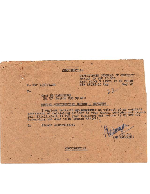 2. During 1971, Operation Eagle initiated the Liberation of Bangladesh with military action in the Chittagong Hill Tracts. In a written statement, his South Column Unit Commander Lieutenant Colonel B K Narayan had stated that this doctor had displayed a great sense of devotion to duty, maturity, physical toughness, and bravery beyond call of duty during Operation Eagle for which he had recommended the doctor for a gallantry award. In his Annual Confidential Report(Officers) for the year 1971-72, Lieutenant Colonel B K Narayan had written: “A very conscientious and Tough MO who worked hard during the Bangladesh Ops. He did very well and showed Maturity, which was beyond the call of duty. I have recommended this Officer for a gallantry award for which he deserves eminently. He is physically tough and cheerful. Is a fresh entrant with less than 2 years of Service and yet he displayed capability and confidence.” This written Annual Confidential Report(Officers) was forwarded by the Office of Inspector General Special Frontier Force to Military Secretary’s Branch(Army), MS 4(CR), MoD on 13th May 1972.