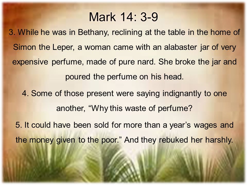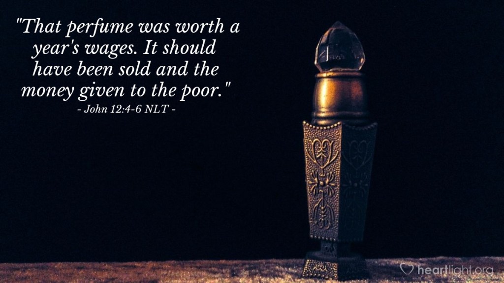 Later, when Jesus was anointed at Bethany with about a pint of pure nard, an expensive perfume; Judas expressed his sense of indignation; “Why wasn’t this perfume sold and the money given to the poor? It was worth a Year’s wages” (John 12:5 and Mark 14:3-9).