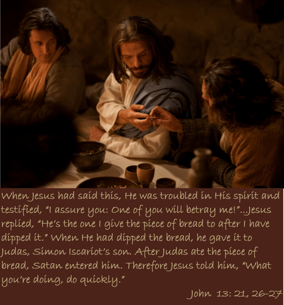 At the “Last Supper” Jesus revealed that one of the Twelve would betray him (John 13:26-27); “As soon as Judas took the bread, Satan entered into him.” Jesus promptly instructed Judas to do what he had already planned to do.