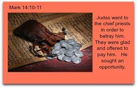 The New Testament Book of Mark records this moral predicament of Judas; then Judas Iscariot, one of the Twelve, went to the chief priests to betray Jesus to them. They were delighted to hear this and promised to give him money. So he watched for an opportunity to hand him over (Mark 14:10-11).