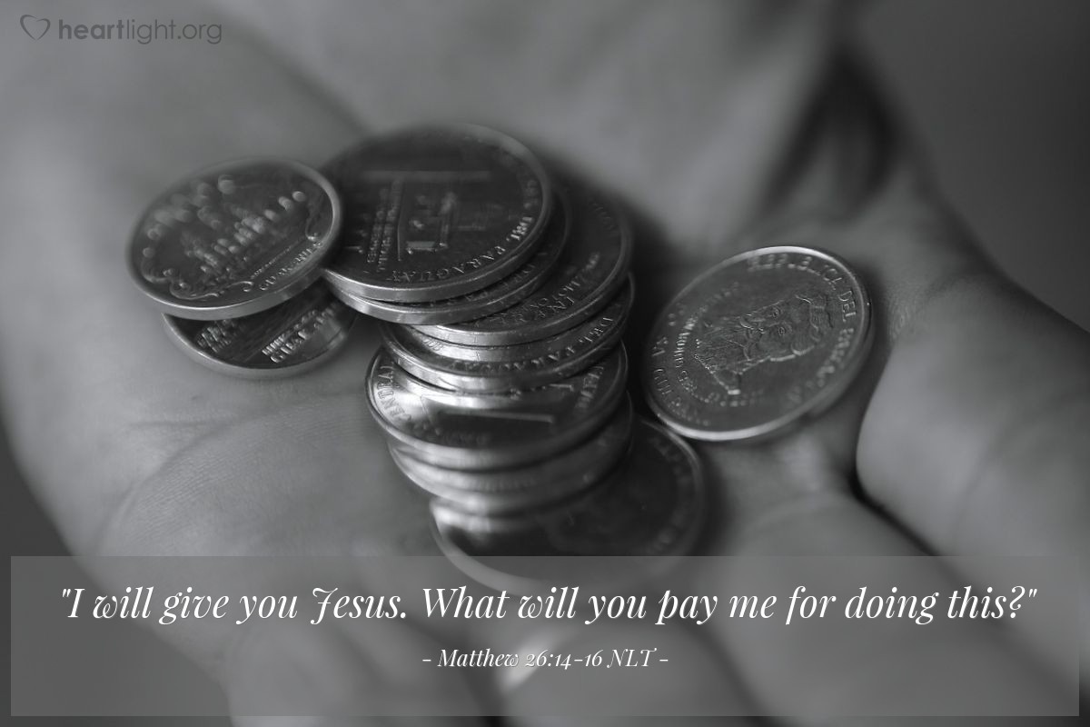 The agreement made by Judas to betray Jesus is recorded in The New Testament Book of Matthew, Chapter 26, verses 14-16; “Then one of the Twelve – the one called Judas Iscariot – went to the chief priests and asked, “What are you willing to give me if I hand him over to you?” So they counted out to him thirty silver coins. From then on Judas watched for an opportunity to hand him over.”
