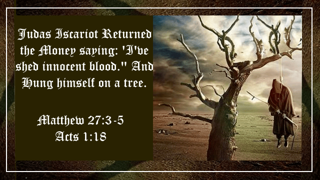 The Book of Matthew, Chapter 27 records in verses #1-5 as to how Judas responded to his own transgression; “Early in the morning, all the chief priests and the elders of the people came to the decision to put Jesus to death. They bound him, led him away and hand him over to Pilate, the governor. When Judas, who had betrayed him, saw that Jesus was condemned, he was seized with remorse and returned the thirty silver coins to the chief priests and the elders. “I have sinned,” he said, “for I have betrayed innocent blood.” “What is that to us?” they replied. “That’s your responsibility.” So Judas threw the money into the temple and left. Then he went away and hanged himself.” Apart from admitting his sinful act, Judas lost interest in seeking material wealth, and without any hesitation he had discarded those silver coins that he had initially coveted.