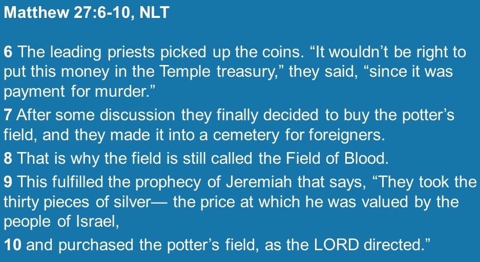 The New Testament Book of Matthew, Chapter 27, verses # 6-10 give a detailed account of the purchase of the ‘Field of Blood’. “The chief priests picked up the coins and said , “It is against the law to put this into treasury, since it is blood money.” So they decided to use the money to buy the potter’s field as a burial-place for foreigners. That is why it has been called the Field of Blood to this day. Then what was spoken by Jeremiah the prophet was fulfilled: “They took the thirty silver coins, the price set on him by the people of Israel, and they used them to buy the potter’s field as the Lord commanded me.”