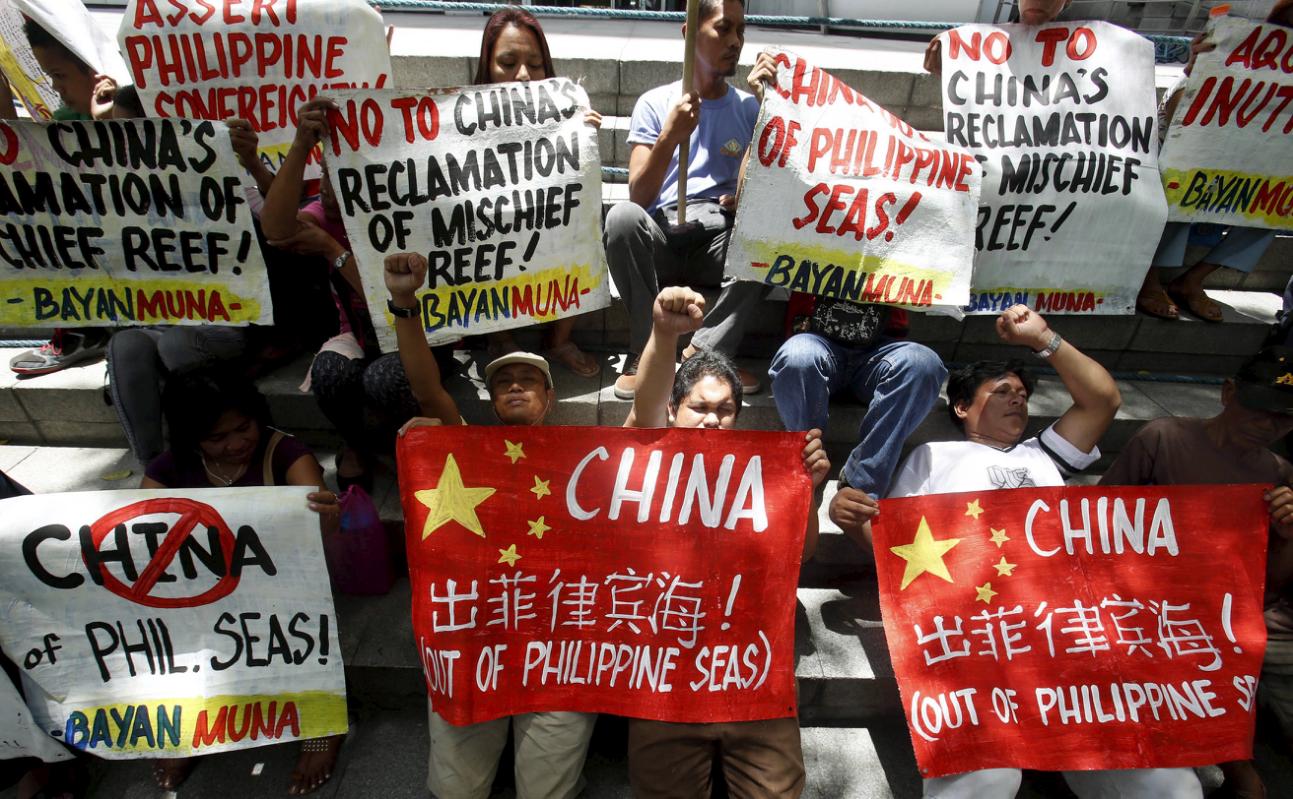 Members of Bayan Muna (Country First) Party List group display placards during a picket rally over territorial dispute with China in South China Sea, outside the Chinese Consulate in Makati, Metro Manila April 17, 2015. Philippine President Benigno Aquino said on Friday the territorial dispute with China in the South China Sea was of concern for the world because global trade will be hit by China’s reclamation. Recent satellite images show China has made rapid progress in building an airstrip suitable for military use in contested territory in the Spratly Islands and may be planning another, moves that have been greeted with concern in the United States and Asia. REUTERS/Erik De Castro