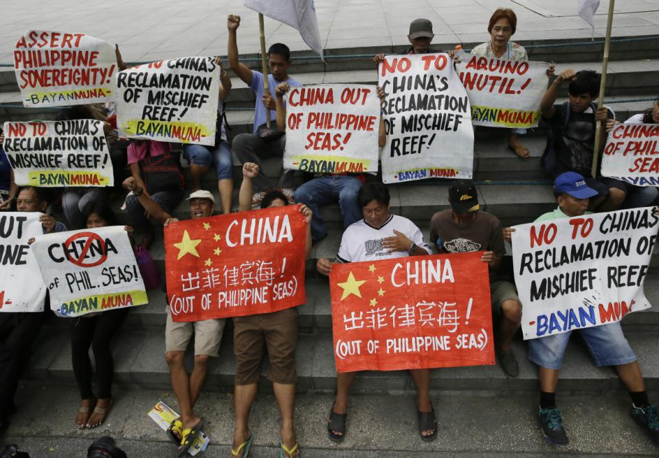 Protesters display placards during a rally at the Chinese Consulate at the financial district of Makati city, east of Manila, Philippines Friday, April 17, 2015 to protest moves by China in “fortifying” its claims at the disputed Spratlys group of islands in the South China Sea. The protesters led by Congressman Nery Colmenares urge China to “stop its reclamation activities in the Mischief Reef” which they claim to be still within the Philippines’ EEZ (Exclusive Economic Zone). (AP Photo/Bullit Marquez)