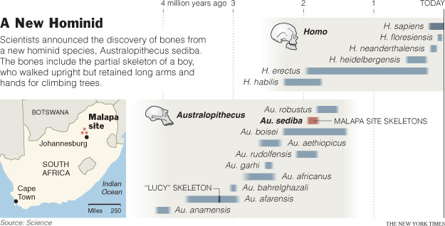 Dr. Delson was referring to Dr. Berger’s previous headline discovery, published in 2010, also involving cave deposits at the Cradle of Humankind site, 30 miles northwest of Johannesburg. He found many fewer fossils that time, but enough to conclude he was looking at a new species, which he named Australopithecus sediba. Geologists said the individuals lived 1.78 million to 1.95 million years ago, when australopithecines and early species of Homo were contemporaries.