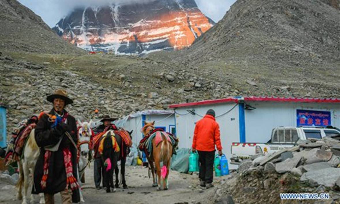People walk on the foot of Mount Kailash in Tibet. June 25, 2018. (Xinhua/Liu Dongjun)