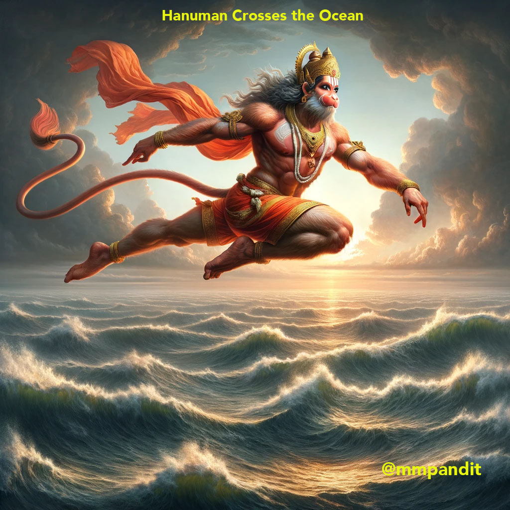 The Indian epic poem of ‘RAMAYANA‘ describes life journey of Lord Rama, the Prince of the Ayodhya Kingdom who was exiled to live in the forest. The story narrates the abduction of His wife, Princess Sita. While searching the forest to find Sita, Lord Rama befriends the ‘VANARA’ or Monkey Forces of Kishkindha Kingdom. The Vanara King Sugriva in an effort to find Sita dispatched his forces in all directions with very strict orders to report back within a month. The search party that proceeded southwards eventually reach the southern sea-shore at the end of their appointed time for reporting back to the King. While they were feeling anxious about their delayed mission, they receive a vital clue about Sita held captive in the island kingdom of Lanka ruled by the demon King Ravana. The search party now gets fearful about the course of action they have to choose. They seek counsel from the eldest member of their party. They decide against returning home with secondhand information about Princess Sita’s whereabouts. After due deliberation, they choose to physically verify the accuracy of the information about Princess Sita’s presence in the island. The action that they selected requires crossing the sea, entering an enemy kingdom, searching diligently tightly guarded places, and returning safely crossing the sea one more time. In the context of this story, as there is no land bridge to reach the island, the safest way to get there is to jump across the sea in one leap. The party’s elder leader recommends entrusting Hanuman with this difficult and challenging mission. The choice of Hanuman is prudent because of His strength, courage, intelligence, and other special abilities like changing of body size at His discretion.