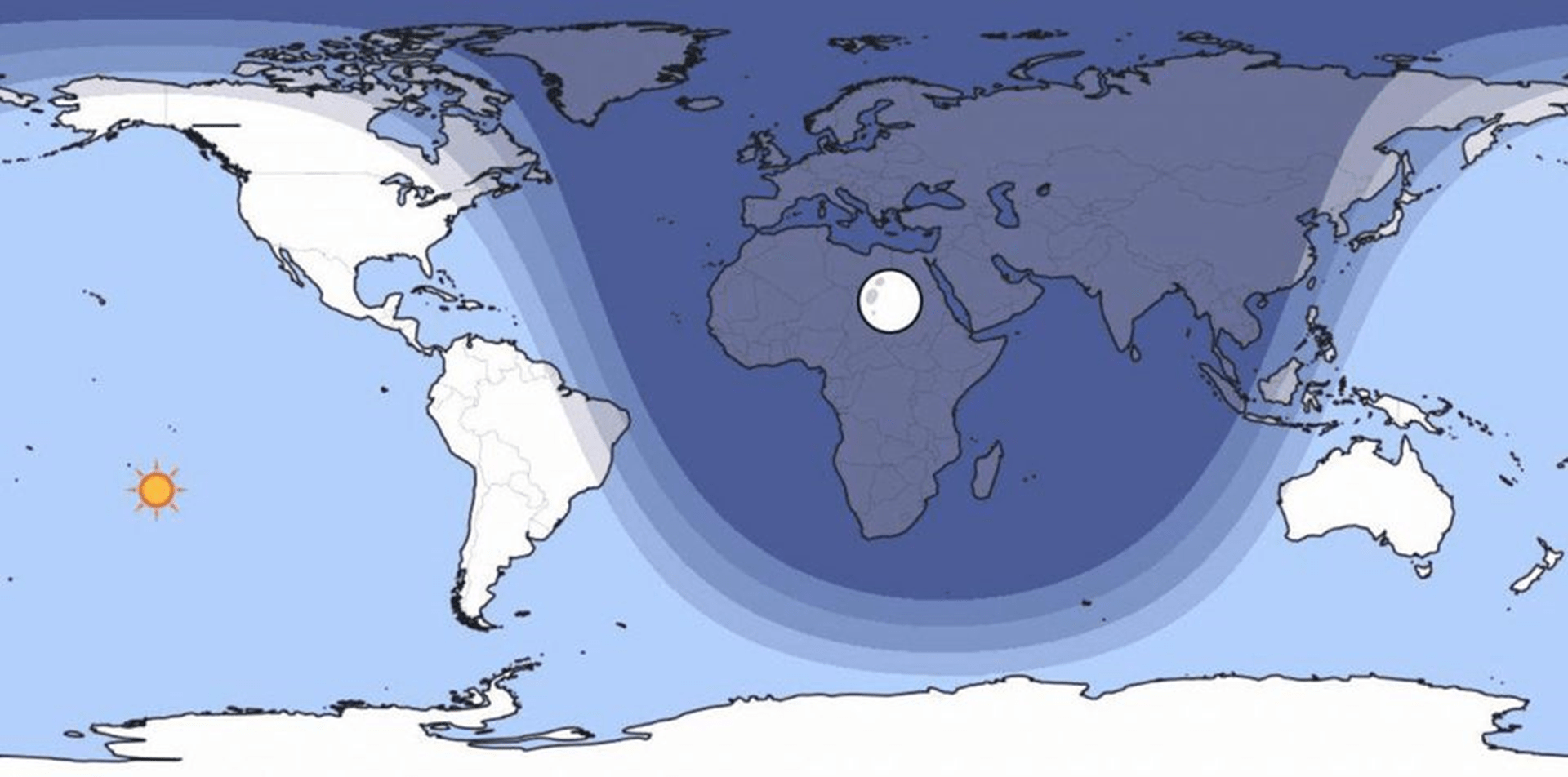 The map below indicates the position of the Sun and areas of sunlight versus darkness at sunset today in New York City, 4:32pm EST.