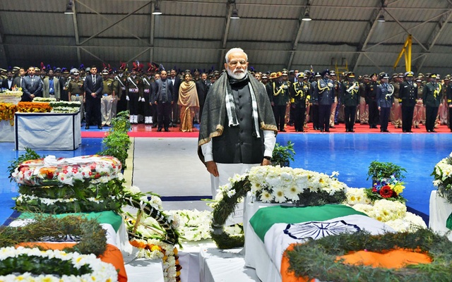 India’s Prime Minister Narendra Modi pays tribute as he stands next to the coffins containing the remains of Central Reserve Police Force (CRPF) personnel who were killed after a suicide bomber rammed a car into a bus carrying them in south Kashmir on Thursday, at Palam airport in New Delhi, India, February 15, 2019. India’s Press Information Bureau/Handout via REUTERS