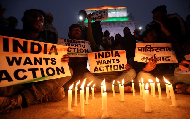 People attend a candlelight vigil to pay tribute to Central Reserve Police Force (CRPF) personnel who were killed after a suicide bomber rammed a car into the bus carrying them in south Kashmir on Thursday, in front of India Gate war memorial in New Delhi, India, Feb. 15, 2019. REUTERS/Anushree Fadnavis