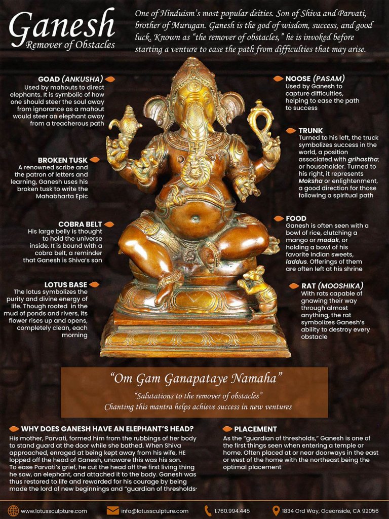 Lord Ganesha is unique among all deities. He has a human form with the head of an Asian elephant. Like the elephant which can grasp objects with its trunk, the entire realm of knowledge is in His grasp. In brilliance, He outshines Sun (Surya) and His radiant appearance can illuminate the entire universe. His body is so huge, it can accommodate the entire creation.