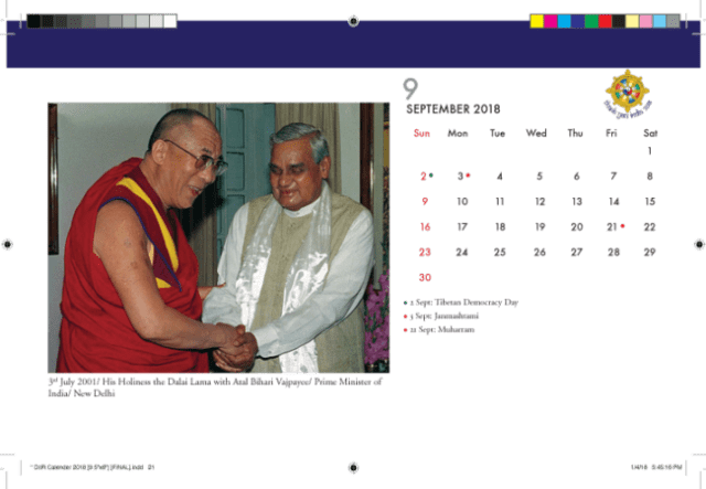 Supreme Ruler of Tibet Marks 65th Milestone of Life’s Journey in Exile. “Thank You India” a cultural program organized in McLeod Ganj, Dharamshala, India on Saturday, March 31, 2018 to mark the 60th Anniversary of Life in Exile. Supreme Ruler of Tibet Marks 65th Milestone of Life’s Journey in Exile. “Thank You India” Year 2018 Calendar marks the 60th Anniversary of Life in Exile. His Holiness the Dalai Lama with Indian Prime Minister Jawaharlal Nehru in Mussoorie, on April 04, 1959. Supreme Ruler of Tibet Marks 65th Milestone of Life’s Journey in Exile. “Thank You India” Year 2018 Calendar marks the 60th Anniversary of Life in Exile. His Holiness the Dalai Lama with Indian President Dr. Rajendra Prasad on April 17, 1961.Supreme Ruler of Tibet Marks 65th Milestone of Life’s Journey in Exile. “Thank You India” Year 2018 Calendar marks the 60th Anniversary of Life in Exile. His Holiness the Dalai Lama with Indian Prime Minister Lal Bahadur Shastri on October 27, 1965.Supreme Ruler of Tibet Marks 65th Milestone of Life’s Journey in Exile. “Thank You India” Year 2018 Calendar marks the 60th Anniversary of Life in Exile. His Holiness the Dalai Lama with Indian President Dr. Sarvepalli Radhakrishnan on May 08, 1964.Supreme Ruler of Tibet Marks 65th Milestone of Life’s Journey in Exile. “Thank You India” Year 2018 Calendar marks the 60th Anniversary of Life in Exile. His Holiness the Dalai Lama with Indian Prime Minister Indira Gandhi on August 06, 1966.Supreme Ruler of Tibet Marks 65th Milestone of Life’s Journey in Exile. “Thank You India” Year 2018 Calendar marks the 60th Anniversary of Life in Exile. His Holiness the Dalai Lama with Indian Prime Minister Morarji Desai on July 22, 1977.Supreme Ruler of Tibet Marks 65th Milestone of Life’s Journey in Exile. “Thank You India” Year 2018 Calendar marks the 60th Anniversary of Life in Exile. His Holiness the Dalai Lama with Indian Prime Minister Charan Singh in 1979.Supreme Ruler of Tibet Marks 65th Milestone of Life’s Journey in Exile. “Thank You India” Year 2018 Calendar marks the 60th Anniversary of Life in Exile. His Holiness the Dalai Lama with Gianni Zail Singh, President of India on August 05, 1985.Supreme Ruler of Tibet Marks 65th Milestone of Life’s Journey in Exile. “Thank You India” Year 2018 Calendar marks the 60th Anniversary of Life in Exile. His Holiness the Dalai Lama with Indian Prime Minister Atul Bihari Vajpayee on July 03, 2001.Supreme Ruler of Tibet Marks 65th Milestone of Life’s Journey in Exile. “Thank You India” Year 2018 Calendar marks the 60th Anniversary of Life in Exile. His Holiness the Dalai Lama with Dr. APJ Abdul Kalam, President of India on January 02, 2009. Supreme Ruler of Tibet Marks 65th Milestone of Life’s Journey in Exile. “Thank You India” Year 2018 Calendar marks the 60th Anniversary of Life in Exile. His Holiness the Dalai Lama with Indian Prime Minister Dr. Manmohan Singh on September 22, 2014.Supreme Ruler of Tibet Marks 65th Milestone of Life’s Journey in Exile. “Thank You India” Year 2018 Calendar marks the 60th Anniversary of Life in Exile. His Holiness the Dalai Lama with Pranab Mukherjee, President of India on December 10, 2016.