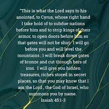Book of Isaiah, chapter 44, verse 28 : God says of Cyrus, “He is my shepherd and will accomplish all that I please; he will say of Jerusalem, “Let it be rebuilt,” and of the temple, “Let its foundations be laid.”