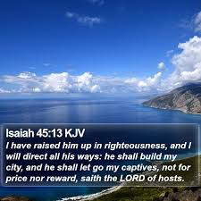 Book of Isaiah, chapter 45, verse 13 : “I will raise up Cyrus in my righteousness; I will make all his ways straight, he will rebuild my city and set my exiles free, but not for a price or reward,” says the LORD Almighty.