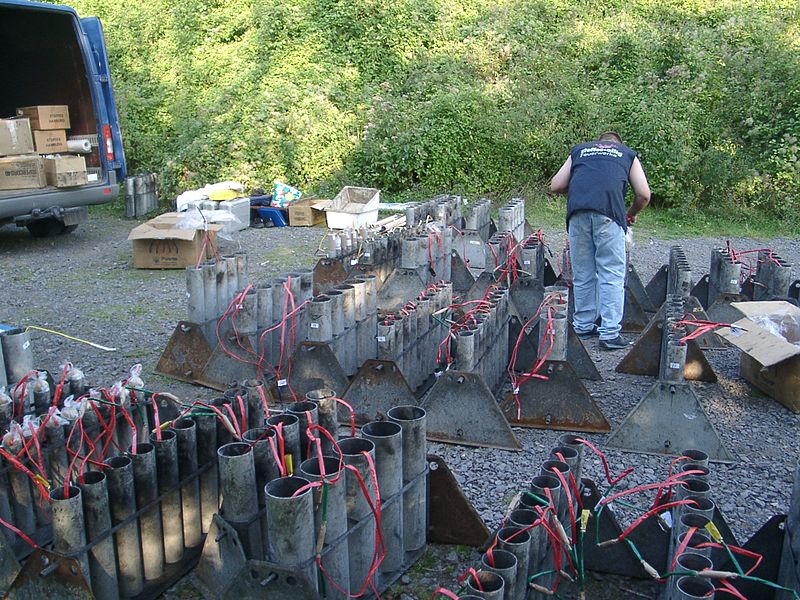 Aerial Shell Fireworks Display – Tragedy at Thapar Stadium: This photo image shows the preparation of Fireworks Mortar Tubes. There is a relationship between the size of the Shell, the Length of the Mortar Tube, the Initial Velocity and the Distance traveled by the Shell. We can predict as to where the Shell may land and calculate the Risk involved to Spectators watching the Show.