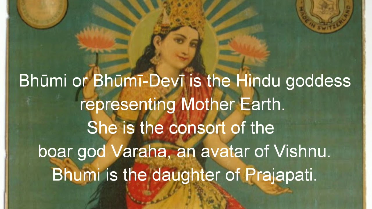 Earth Goddess, Bhumi Devi, you originated from the Creative Power of Lord Vishnu and you display the complexion of a Conch shell, you produce a variety of gems and precious stones. I join and press my palms together and bow my head to offer my salutations to you.