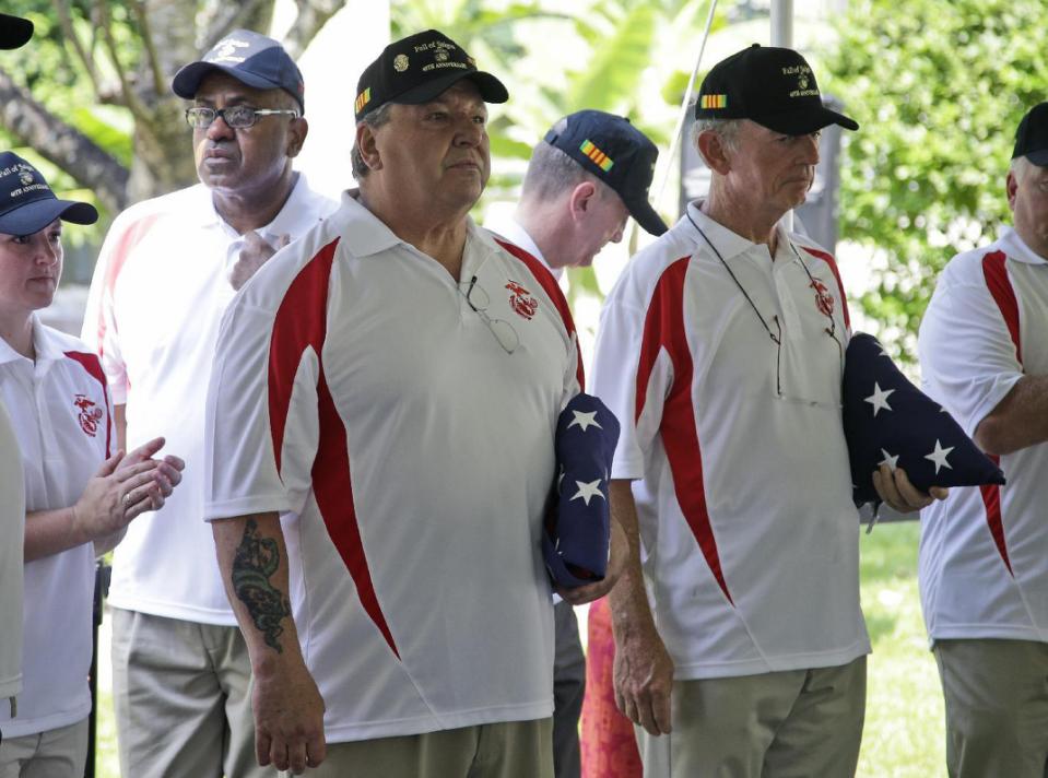 Former U.S Marines pose for a group photo during the unveiling ceremony of a plaque dedicated to the …