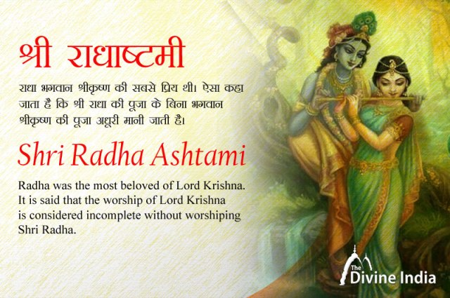 Radha Ashtami is also known as Radhashtami and Radha Jayanti. In the Indian tradition, the Lord God Creator is the Controller of Power/Force/Energy that operates all interactions of the natural world, and the universe. The Lord God Creator separates Himself from the Power/Force/Energy that He Controls, Regulates, Sustains, and Operates. In the Indian tradition, the Power/Force/Energy or Shakti is personified as the consort of Lord God Creator. As the manifestations of Power/Force/Energy are varied, each attribute acquires a personality of its own and the man easily recognizes the nature of the blessings he receives from his benefactor. In the Indian tradition, Goddess Radha is the personification of Love that symbolizes the Spiritual Unity between the Original Source of Love and the physical manifestation of the Force called Love.