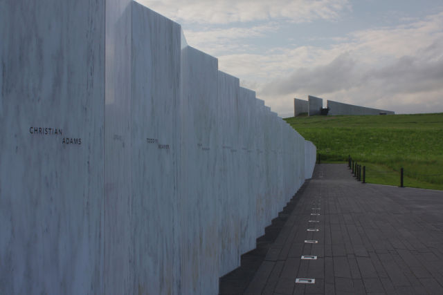 • The Flight 93 National Memorial is located at the site of the crash of United Airlines Flight 93 about 2 miles north of Shanksville, Pennsylvania. The memorial honors the 40 passengers and crew who died on 9/11. It features concrete walls outlining the Flight Path Walkway and a white marble Wall of Names. There are also plans to construct a 93-foot tower to designate the entrance of the Flight 93 National Memorial which will contain 40 wind chimes — one for each passenger and crew member who died.