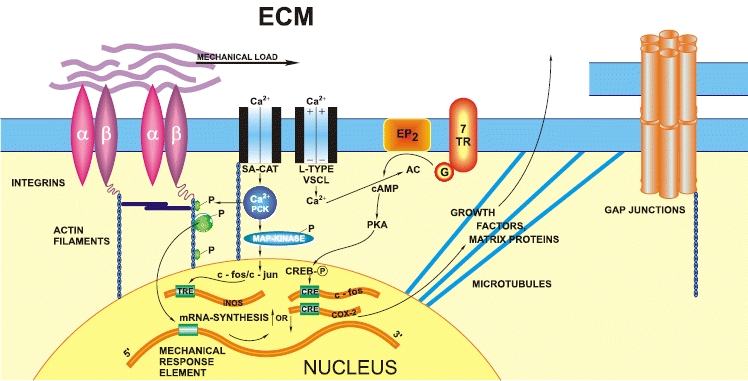 SPIRITUALITY SCIENCE – WHOLE LINGUISTICS – WHOLE LANGUAGE: THIS DIAGRAM OR MODEL OF SIGNAL TRANSDUCTION PATHWAY IN MECHANOTRANSDUCTION EXPLAINS MECHANOSENSITIVITY IN CELLS AND TISSUES. SOME OF THE ABBREVIATIONS ARE, EP2-PROSTAGLANDIN RECEPTOR 2, 7TR-SEVEN TRANSMEMBRANE HELIX RECEPTOR, G GTP-BINDING PROTEIN, cAMP-CYCLIC ADENOSINE MONOPHOSPHATE, PKA-PROTEIN KINASE A, PKC-PROTEIN KINASE C, CRE-cAMP RESPONSE ELEMENT. MAN HAS TO DEVISE NUMEROUS TERMS TO SPEAK ABOUT LIVING FUNCTIONS WHICH TAKE PLACE WITH NO CONCERN FOR USING VOCABULARY.
