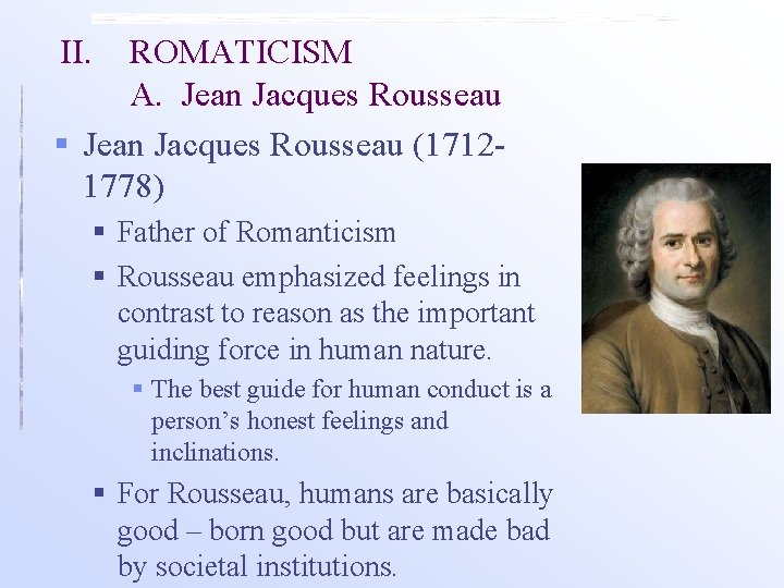 JEAN-JACQUES, ROUSSEAU (b.JUNE 28, 1712, GENEVA, SWITZERLAND-d. JULY 2, 1778, ERMENONVILLE, FRANCE) FRENCH PHILOSOPHER, POLITICAL THEORIST WHOSE IDEAS INSPIRED THE LEADERS OF THE FRENCH REVOLUTION.