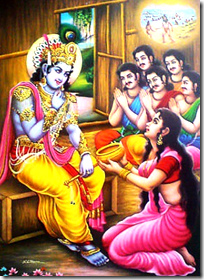 As per the story from Mahabharata, one evening, Draupadi found herself in a troubled situation. A Hindu sage by the name of Durvasa with a large entourage of his disciples arrived at the forest abode of Pandavas after Draupadi had taken the last meal from Akshaya Paatra. She prayed to Lord Krishna seeking help to feed her guests. Lord Krishna appeared before her and asked her to feed Him from Akshaya Paatra. Draupadi regretfully answered that the pot was empty. He directed her to take a closer look. Draupadi carefully reexamined the pot and discovered a single grain of rice that was stuck in the pot. As instructed, she fed the last grain from the pot to Lord Krishna and now the pot became truly empty. Lord Krishna derived His satisfaction when the last grain from the pot was removed and simultaneously, the entire party of guests experienced full satiation and Draupadi escaped from the burden of actually feeding them that evening.