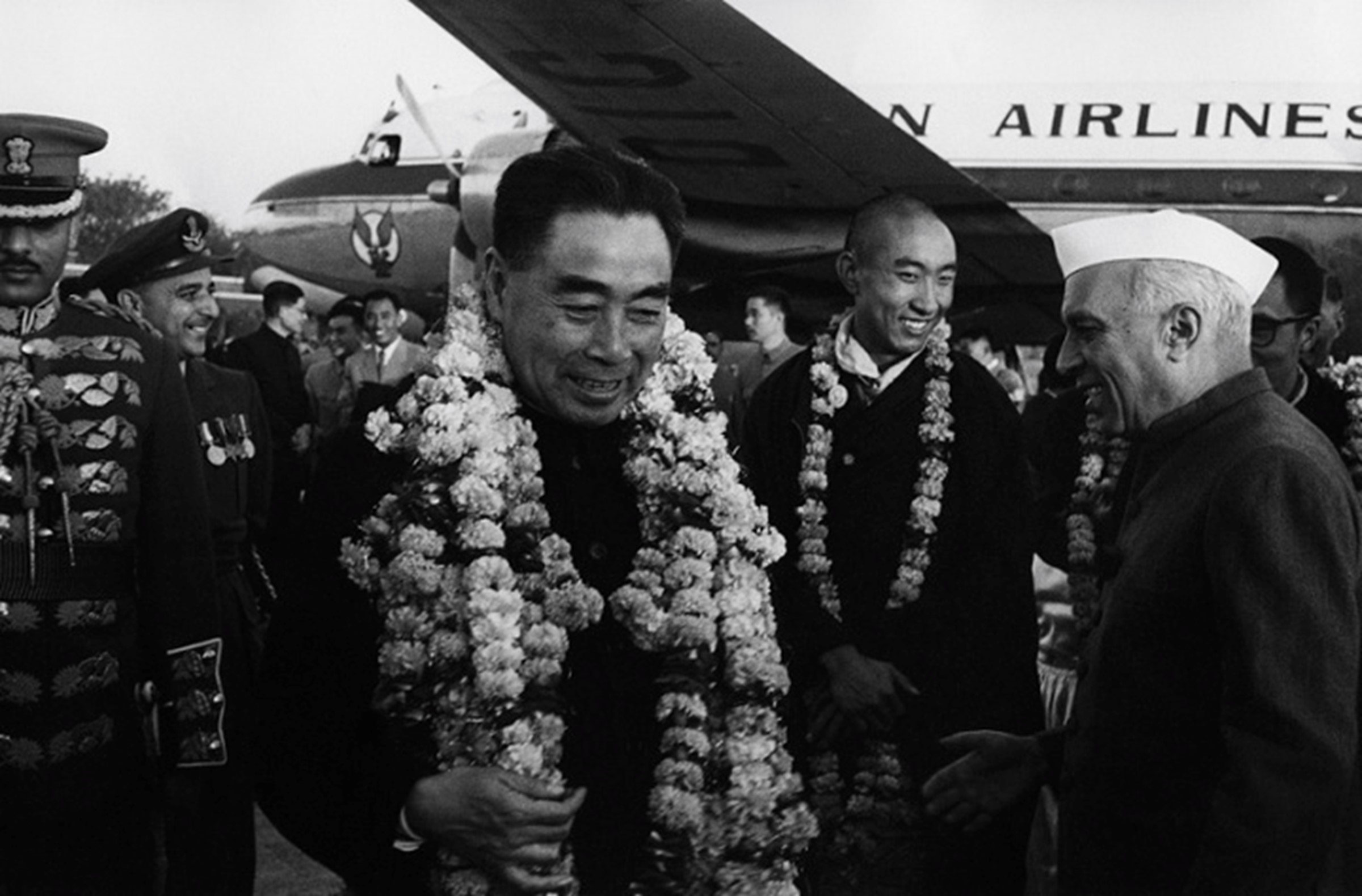 Chinese Prime Minister Zhou Enlai visited New Delhi, India in June 1954 after his initiative called the Five Principles of Peaceful Coexistence (PANCHSHEEL). The first President of India, Dr Rajendra Prasad (first right), Vice President Radhakrishnan third right, and India’s Prime Minister Jawaharlal Nehru is at the far left.