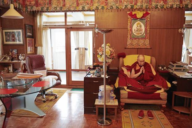 Around 300 people brave the February chill to offer white khata scarves and receive the Dalai Lama’s blessing. There’s a group from Bhutan in traditional checkered dress. A man from Thailand has brought his Liverpool F.C. scarf, seeking divine benediction for the U.K. soccer team’s title bid. Two women lose all control as they approach the Dalai Lama’s throne and are carried away shaking in rapture, clutching prayer beads and muttering incantations.