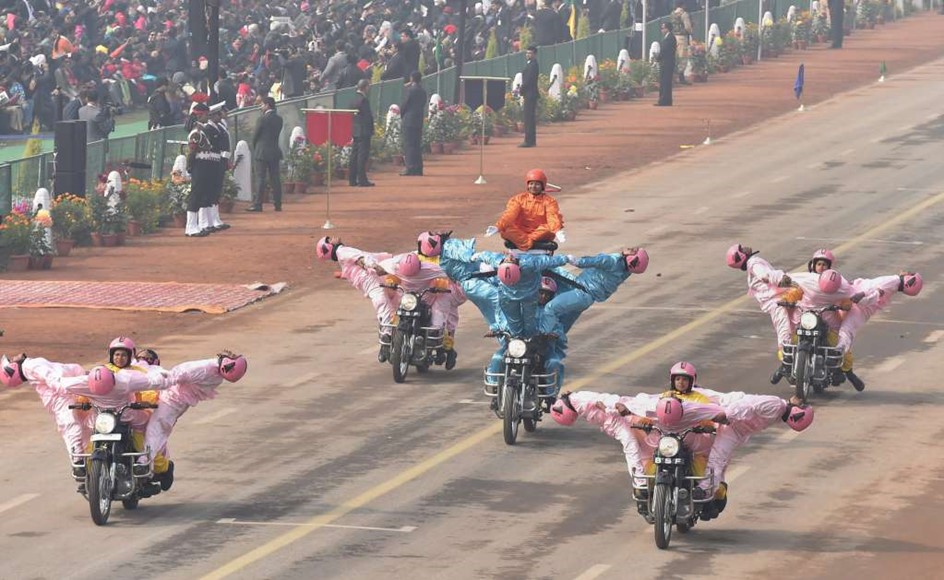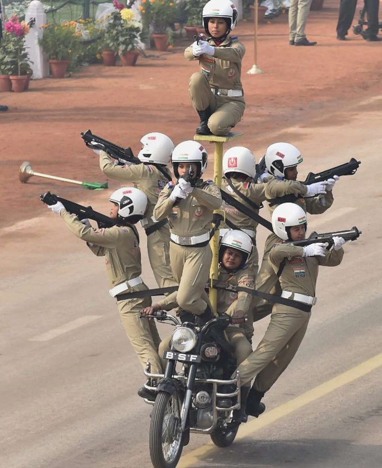 BSFs all-women team Seema Bhawani performs on motorcycles during 69th Republic Day Parade at Rajpath in New Delhi on Friday. (Image: PTI)