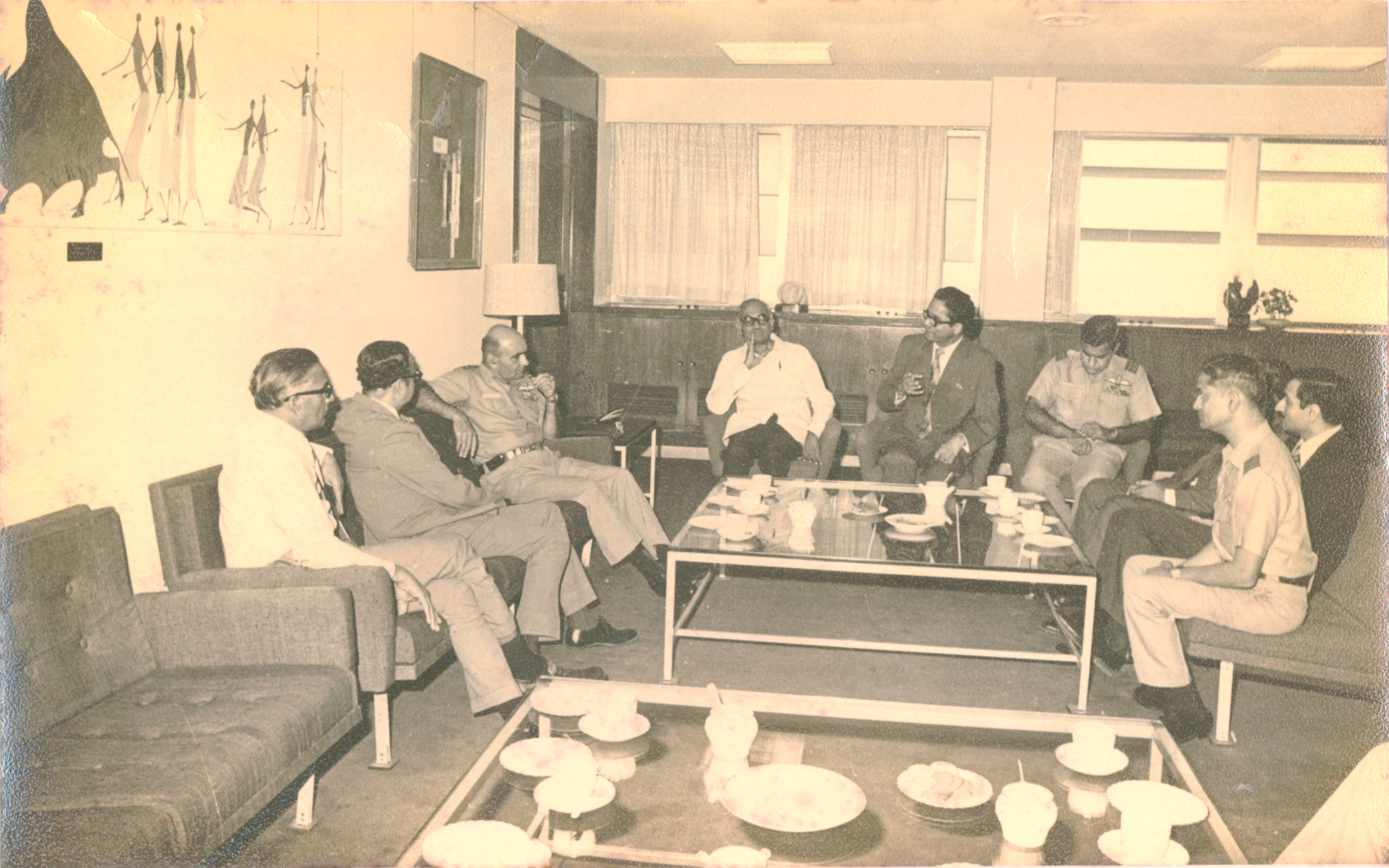 BHARAT DARSHAN – INDIA’S FIRST COMPUTER. AT ‘TIFR’, PROFESSOR PVS RAO WELCOMED INDIAN AIR CHIEF MEHTA WHO CAME TO DISCUSS THE DEVELOPMENT OF AIR DEFENCE DATA HANDLING SYSTEM (Air Defence Ground Environment System or ADGES).BHARAT DARSHAN – INDIA’S FIRST COMPUTER. AT ‘TIFR’, DR. PVS RAO ( SECOND FROM LEFT, SEATED ON A SOFA FACING THE CAMERA) HELD DISCUSSIONS WITH INDIAN AIR CHIEF MEHTA TO DEVELOP INDIA’S AIR DEFENCE DATA HANDLING SYSTEM (Air Defence Ground Environment System or ADGES).