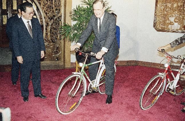 Whole Dude-Whole Sin : February 25, 1989. President George Herbert Walker Bush(41st president of the US 1989-1993) riding the bike given by China’s Communist Party leader, Premier Li Pang in Beijing. President Bush who had earlier served as the Director of CIA is fully aware of the US military alliance/pact with India, and Tibet to face the military threat posed by Communist China’s occupation of Tibet since 1950.