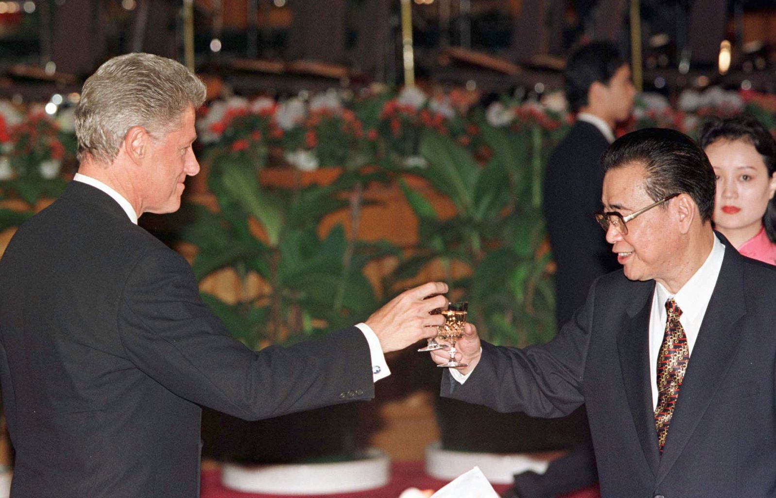 Whole Dude-Whole Sin : June 27, 1998. President William Jefferson Clinton(42nd president of the US 1993-2001) with China’s Communist Party leader and Premier Li Peng in Beijing. A willingness to serve the Enemy.